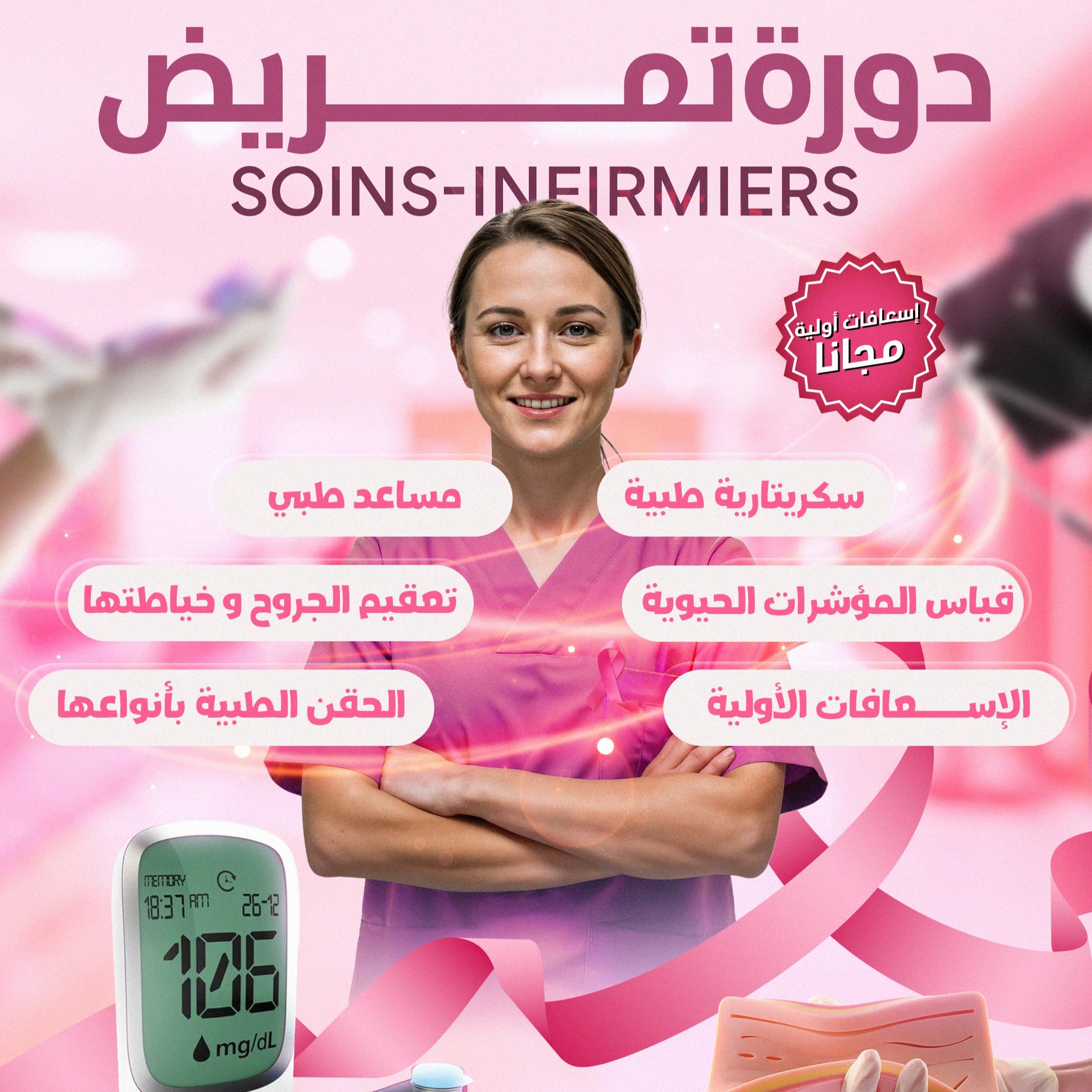 تأخذك دورتنا Soins Infirmiers في تجربة تطبيقية تكتسب فيها أهم المهارات الطبية والتمريضية، من الحقن إلى الخياطة الطبية, تعقيم الجروح و الحروق, قياس وتحليل العلامات الحيوية ونختمها بالإسعافات الأولية، بإشراف خبراء في المجال الصحي.